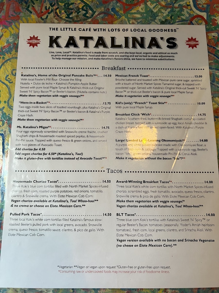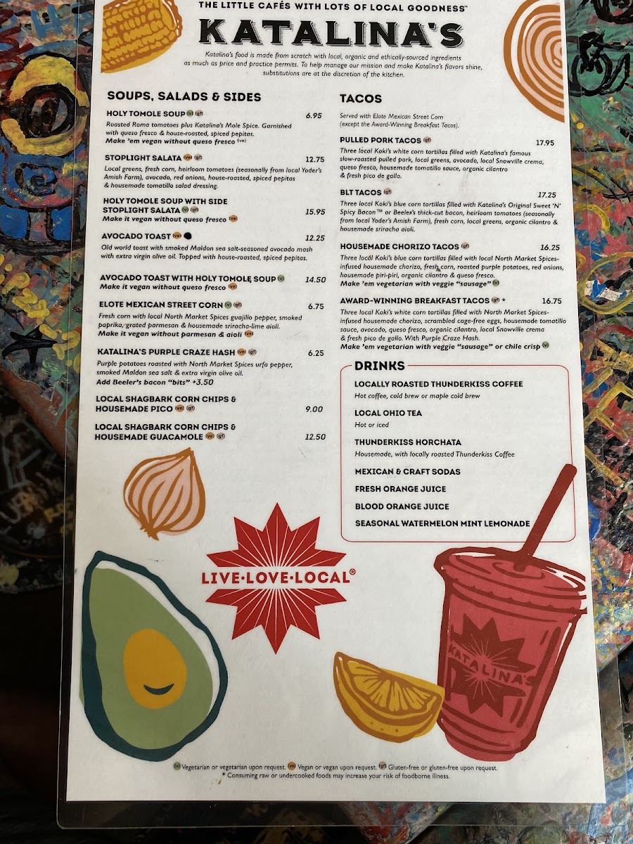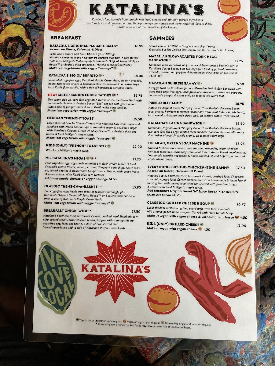 As you step inside Katalina's, prepare to be enveloped in a warm and colorful atmosphere, enhanced by the creativity and artistry reflected throughout the space. The restaurant not only nourishes your stomach but also your spirit, providing a playful backdrop where guests are encouraged to express themselves with paint markers while they wait for their meals.