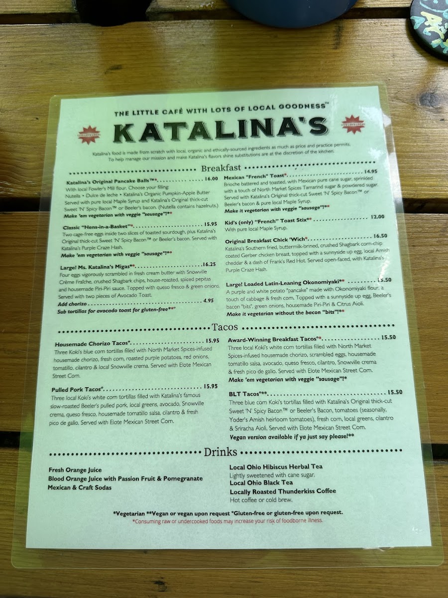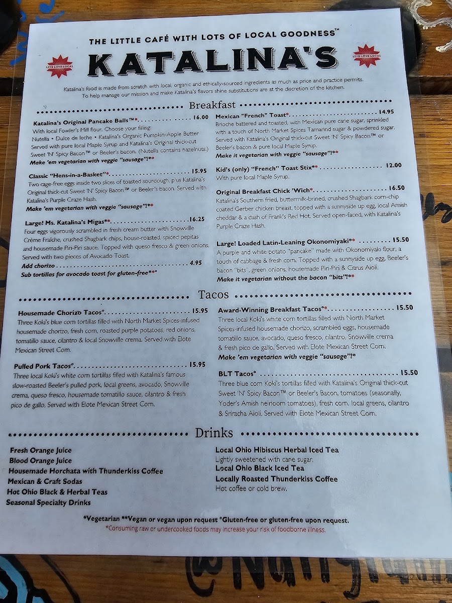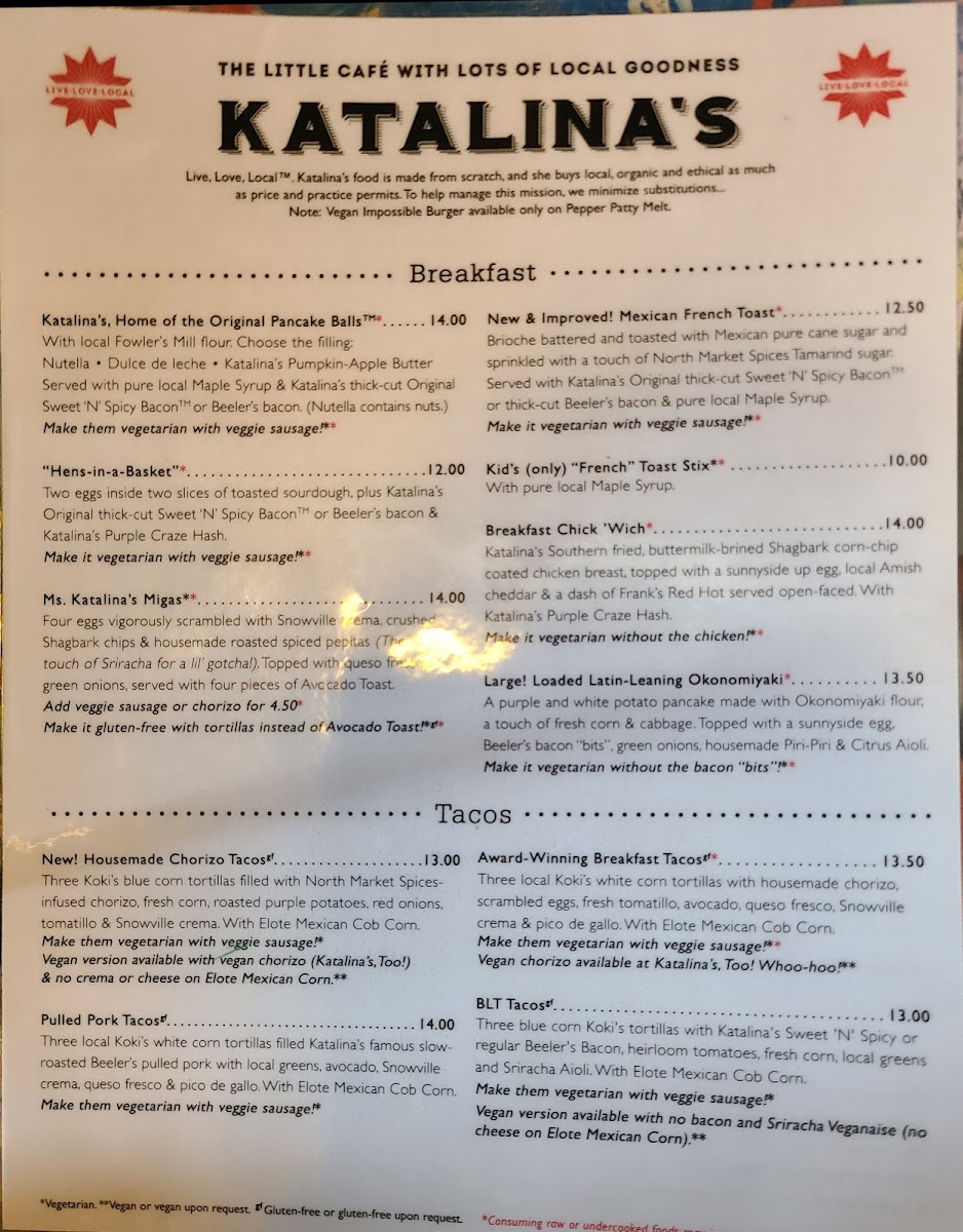Katalina's menu is a celebration of well-sourced ingredients, featuring standout items that speak to both the heart and palate. Start your adventure with their AWARD-WINNING BREAKFAST TACOS—a hearty trio of Koki's white corn tortillas filled with housemade chorizo, scrambled cage-free eggs, and a punchy tomatillo sauce. This delightful dish is complemented by creamy avocado, queso fresco, and a sprinkle of fresh cilantro, all served alongside addictive Elote Mexican Street Corn. Prefer a meatless option? The veggie "sausage" variant offers a fantastic alternative that doesn't sacrifice flavor.