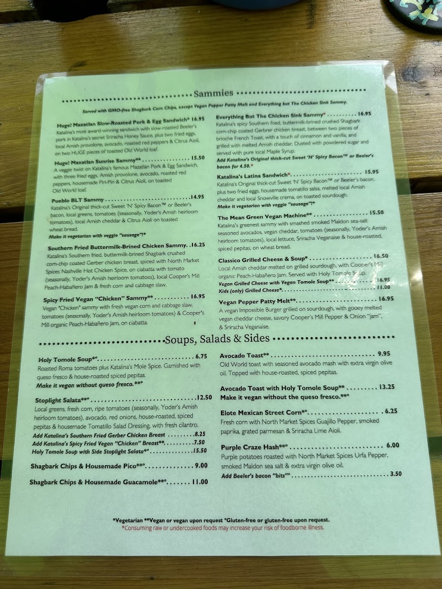 For those who appreciate sandwiches, the MAZATLAN SLOW-ROASTED PORK & EGG SANDWICH stands out as an absolute must-try. This award-winning dish beautifully blends slow-roasted Beeler's pork with Katalina's secret sauce, enriched by fried eggs, local Amish provolone, and citrus aioli, all housed in generous slices of toasted Old World bread. It’s a meal that champions both satisfaction and taste, perfect for hungry diners.